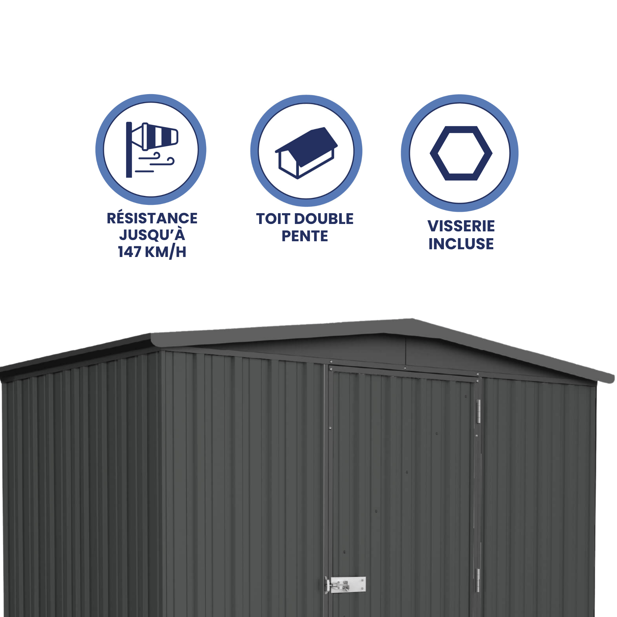 Avec son design contemporain gris anthracite et son traitement anti-UV, l’abri conserve son esthétique au fil du temps. Sa toiture double pente et sa hauteur intérieure de 200 cm offrent un volume utile pratique, parfaitement adapté pour entreposer outils, petit mobilier de jardin ou équipements de loisirs.