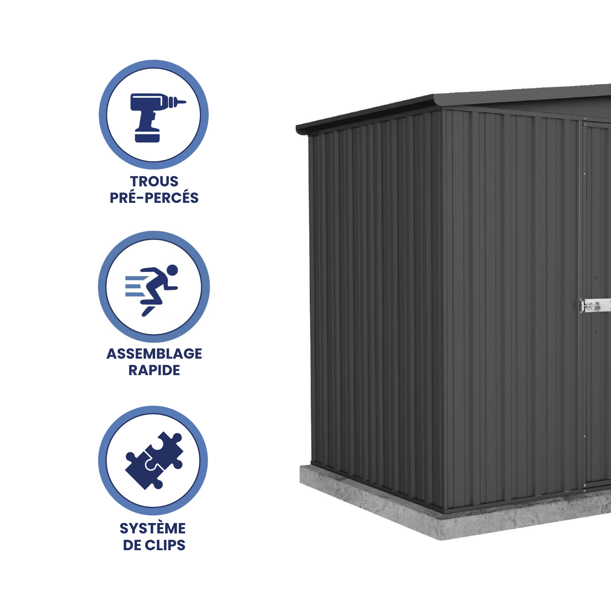 - Surface de 3,2 m² : idéal pour le petit outillage ou mobilier
