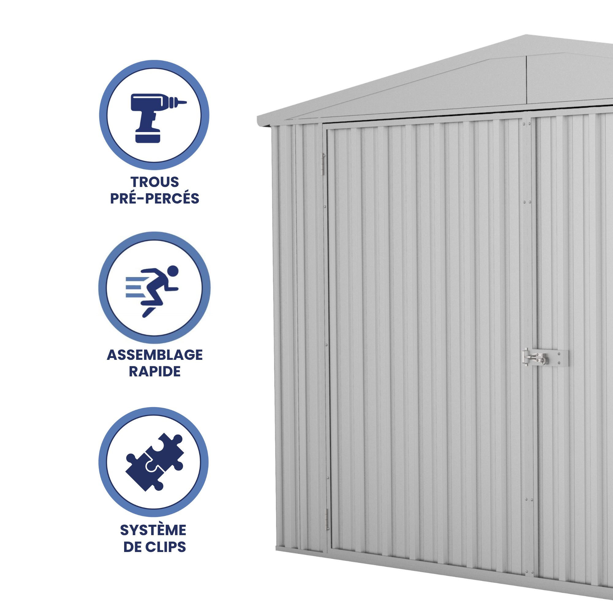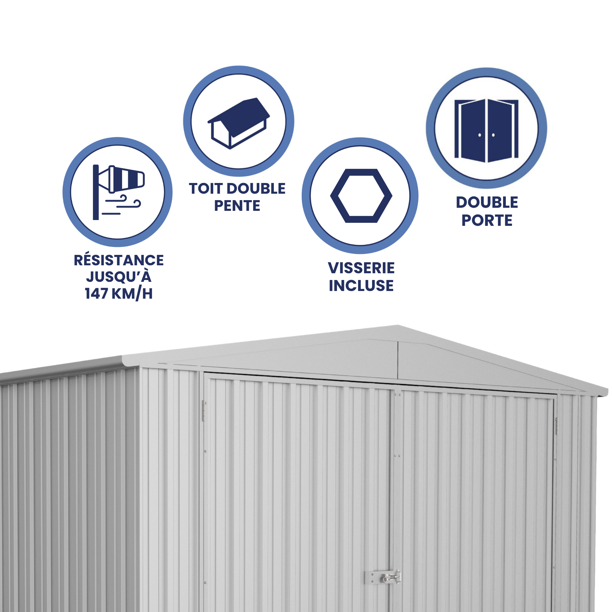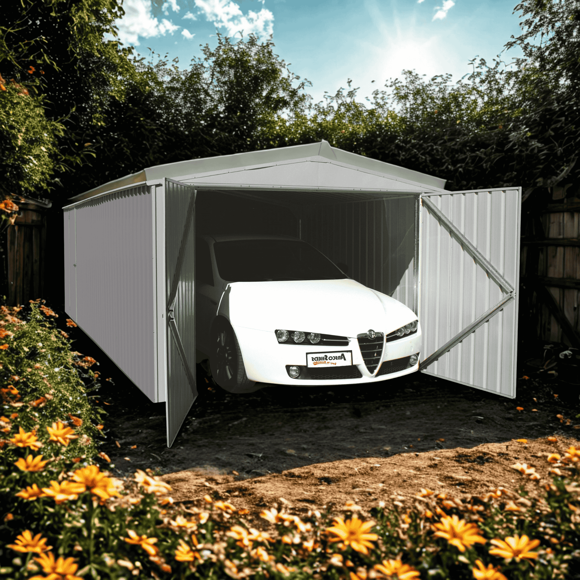 Grâce à ses parois épaisses de 0,35 mm et à une structure métallique robuste, le garage supporte des vents supérieurs à 140 km/h, assurant une protection optimale. Le système de clips breveté permet un montage rapide, avec un minimum de vis, tout en garantissant une grande stabilité.