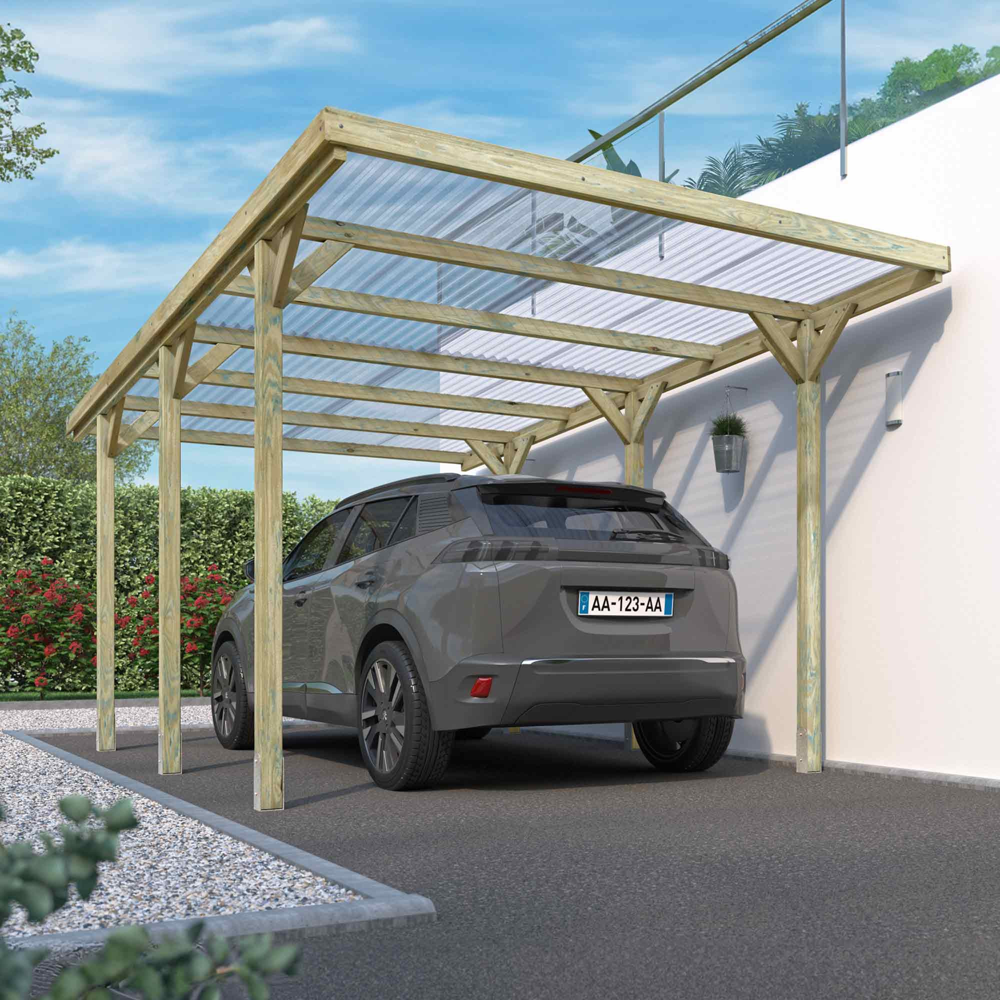 Sa toiture en simple pente transparente assure une protection optimale tout en laissant passer la lumière, créant un espace abrité lumineux et agréable. Les dimensions généreuses (252 x 304 x 512 cm) offrent un stationnement confortable, tandis que le traitement anti-UV garantit une résistance renforcée face aux rayons du soleil et aux intempéries.
