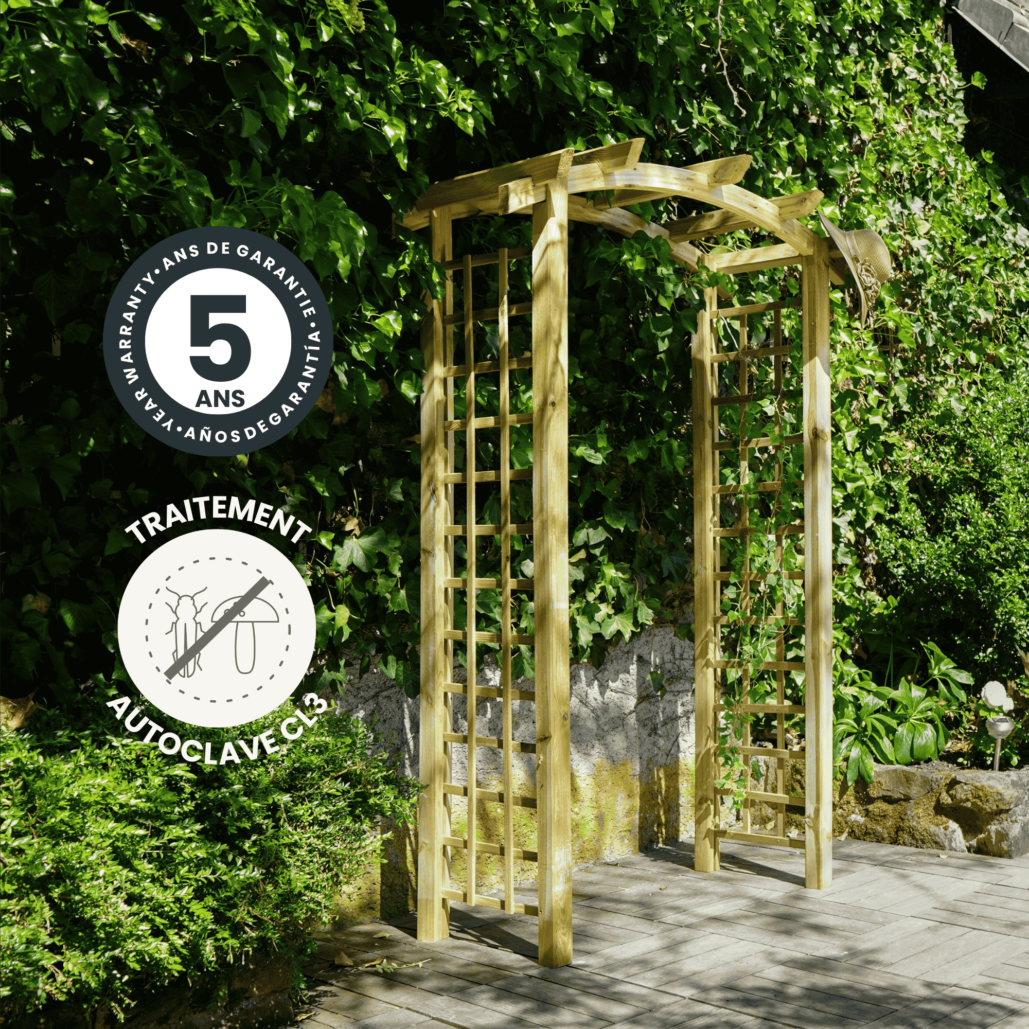 Polyvalente, elle peut servir d’entrée élégante en habillant une allée, ou se transformer en coin détente romantique sur la pelouse, agrémentée de guirlandes lumineuses ou de plantes grimpantes. Ses lattes latérales facilitent la croissance du lierre, du chèvrefeuille ou des rosiers, ajoutant une touche de verdure et de fraîcheur. Sa jolie teinte bois associée à sa forme arrondie donne un côté chaleureux et raffiné.