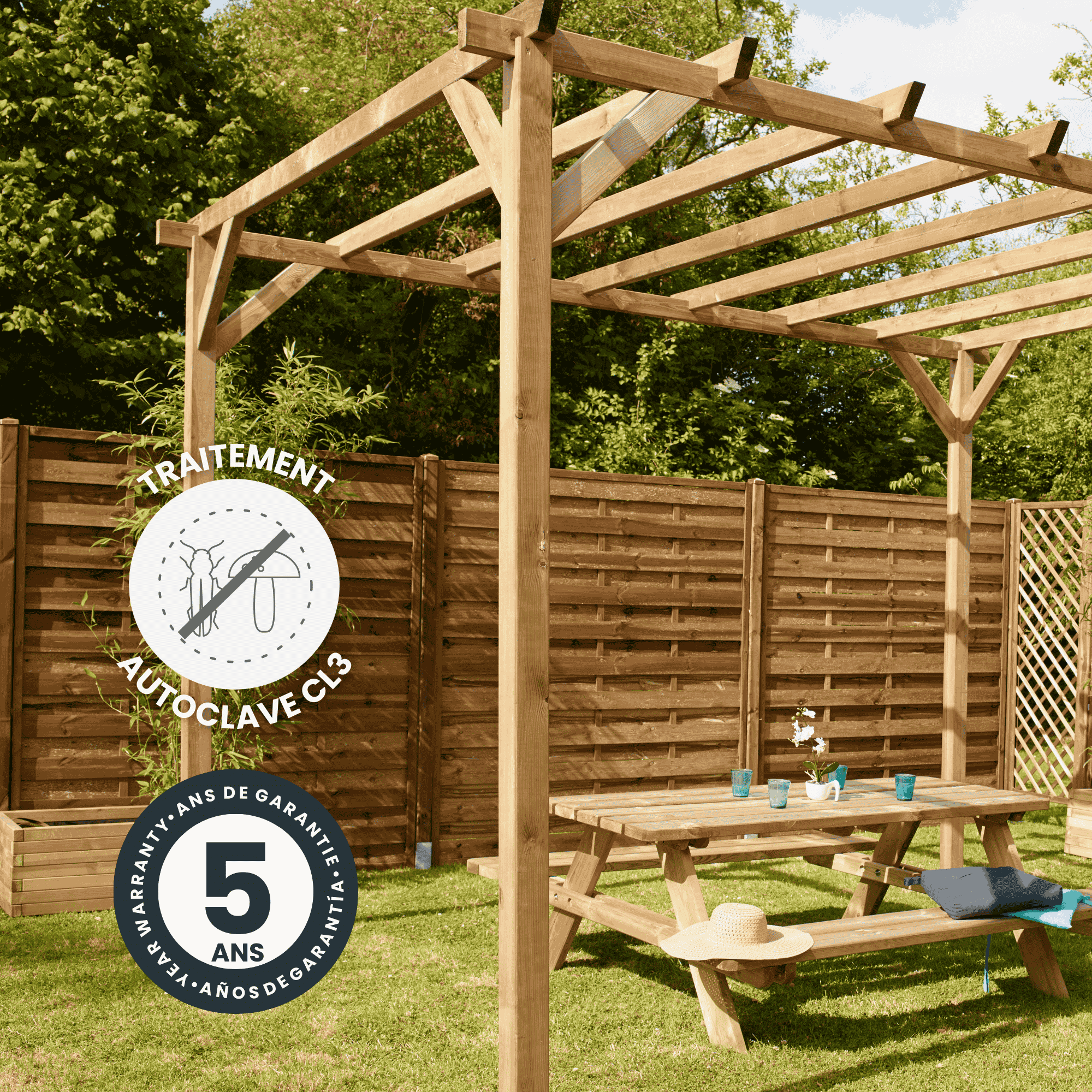 Facile à assembler, la Pergola MAGDALIE est conçue pour une installation sans contrainte. Les variations naturelles du bois font partie de son authenticité et n’altèrent en rien sa solidité. Elle s’impose ainsi comme un choix idéal pour aménager votre jardin avec style et durabilité.