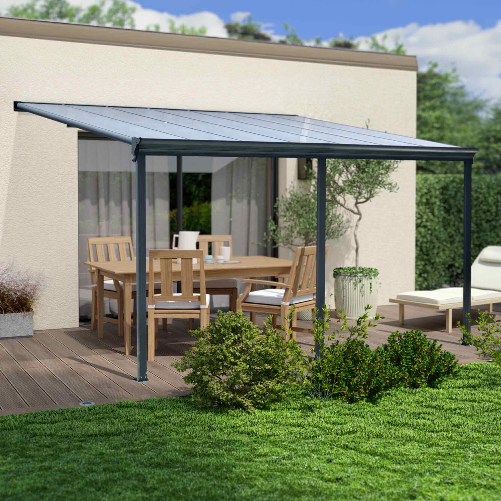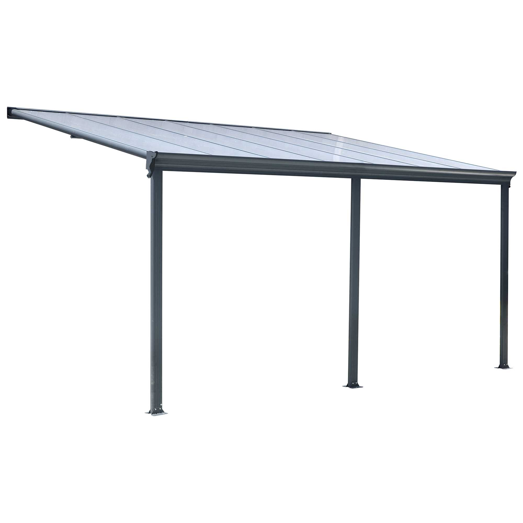Dotée d’un toit en polycarbonate gris transparent de 6 mm, cette pergola offre une protection efficace contre les rayons UV tout en laissant passer une lumière douce et agréable. Son toit monopente assure une bonne évacuation de l’eau de pluie, tandis que sa conception adossée au mur optimise l’utilisation de votre espace extérieur.