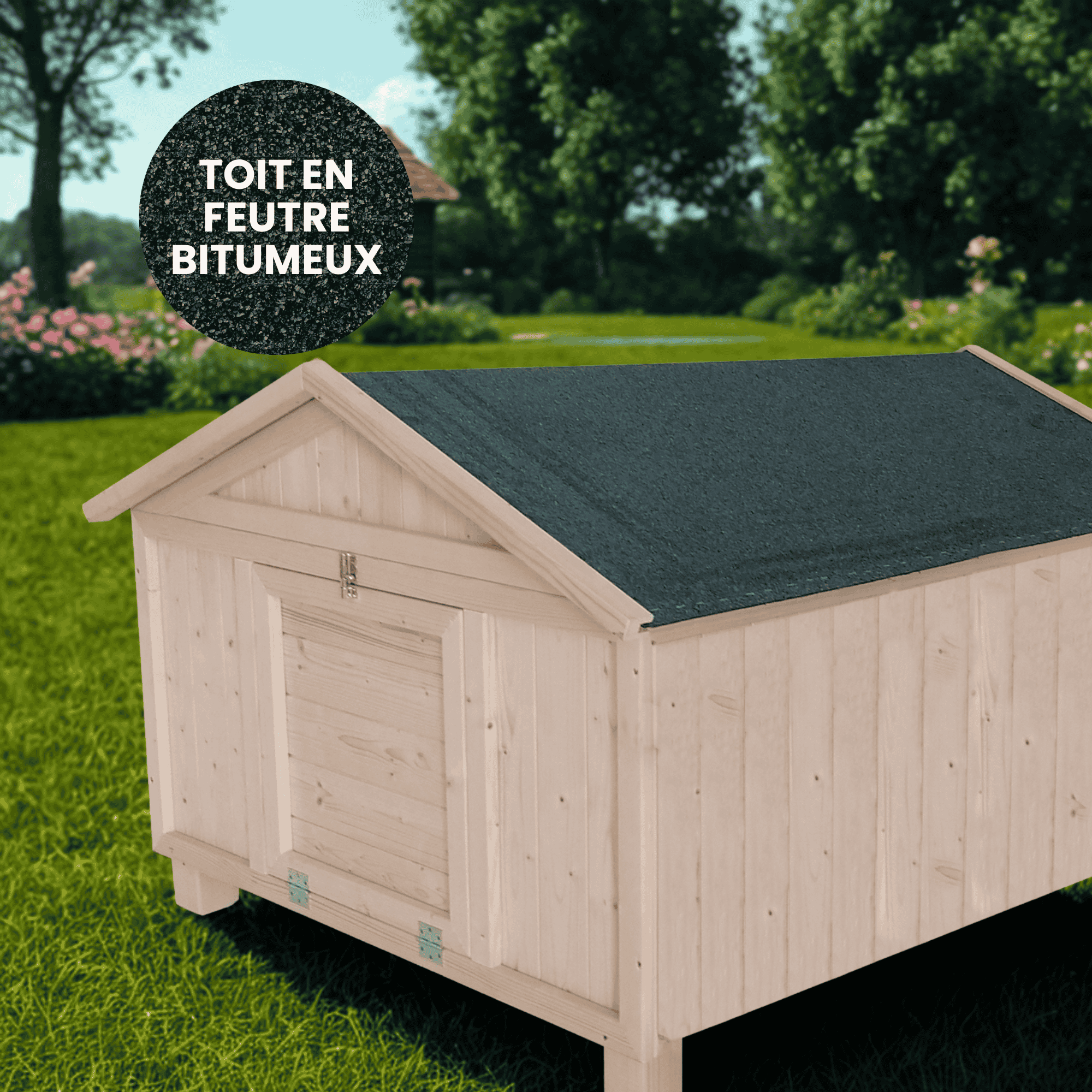 Le poulailler Mady allie sécurité, praticité et design authentique pour vos poules, avec des dimensions compactes de 118 x 154 x 88 cm, occupant seulement 1,5 m² de votre jardin. Grâce à son toit en feutre bitumeux, il protège vos poules contre les intempéries, et ses deux roues permettent de le déplacer facilement pour offrir à vos poules un accès constant à de l'herbe fraîche.