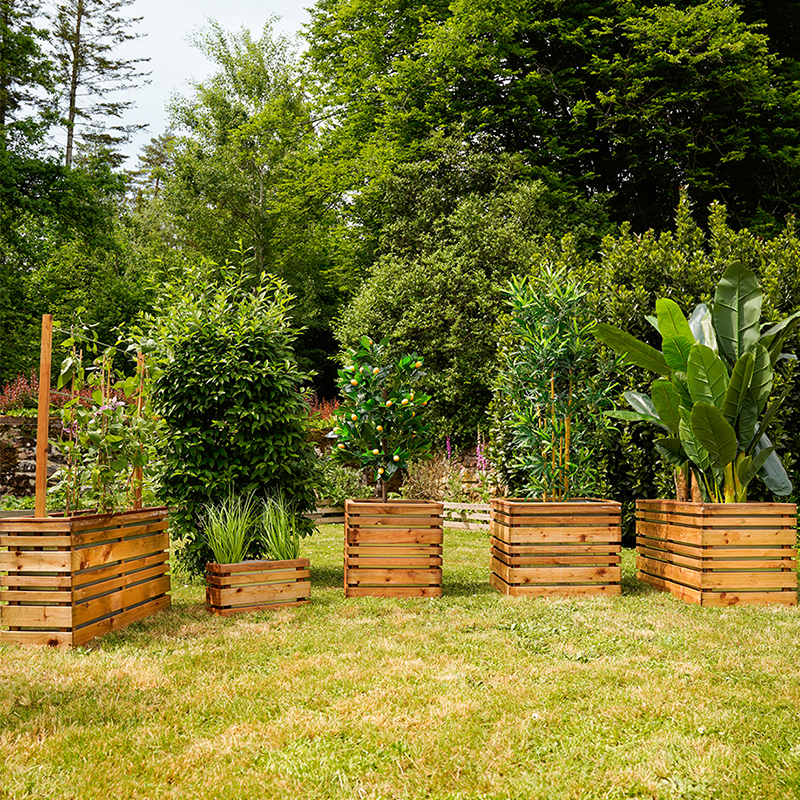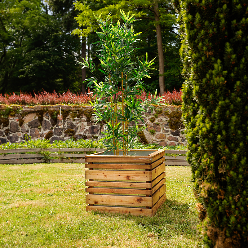 Avec des dimensions généreuses de 60 × 60 cm et 50 cm de hauteur, il accueille des plantes jusqu’à 145 cm de hauteur, comme orangers, palmiers ou bambous, offrant un espace idéal pour leur croissance et leur mise en valeur.