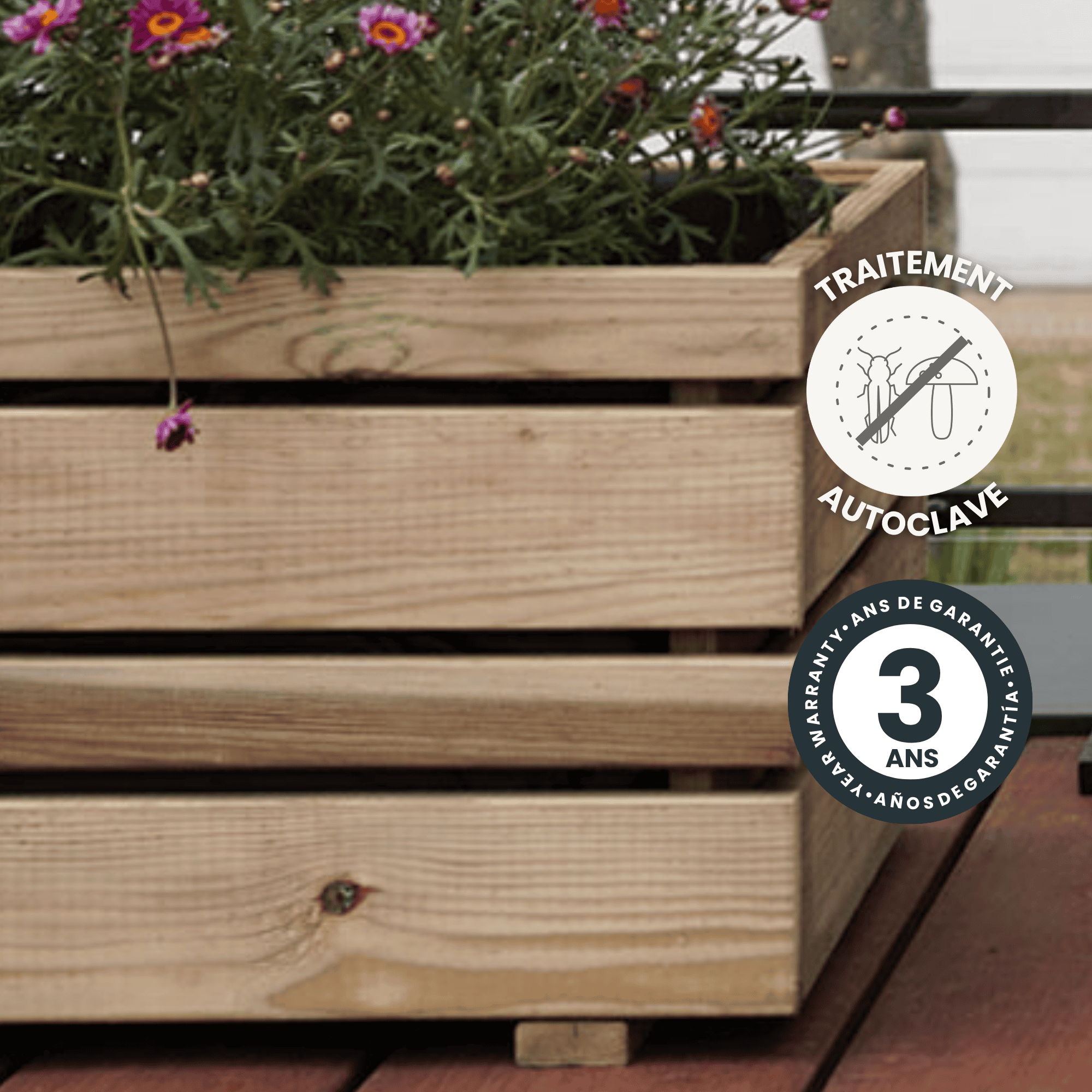 Conçu pour durer, le bac OSLO bénéficie d’un assemblage solide par vis galvanisées et repose sur des pieds intégrés qui garantissent à la fois une stabilité optimale et un bon drainage de l’eau. Son traitement autoclave lui confère une excellente résistance aux intempéries, pour un usage durable et fiable.