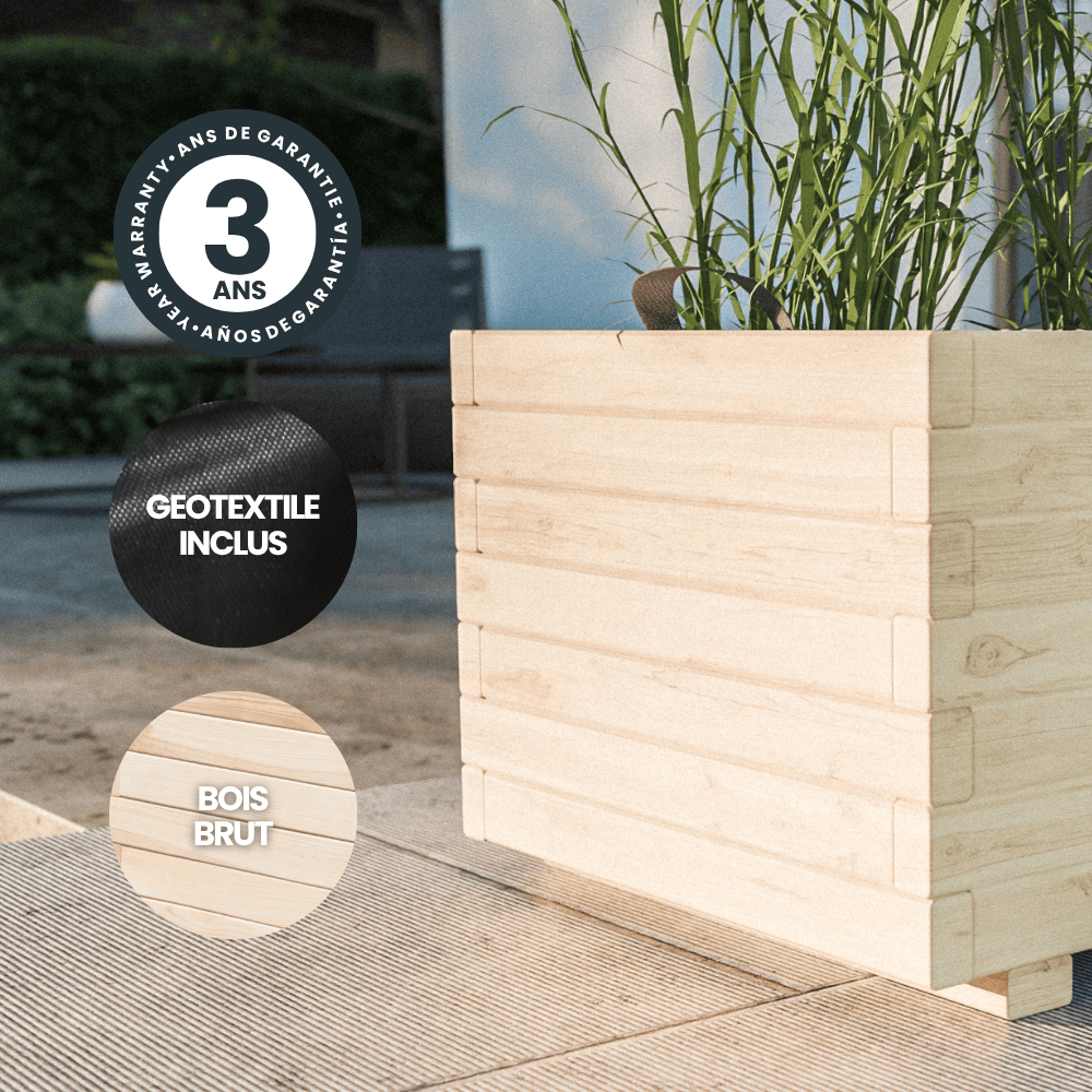 Le bac à fleurs BARDANE (50 x 50 x 38 cm) se distingue par son design intemporel sans vis apparente et ses sections de bois élégantes, apportant une touche authentique et raffinée à votre espace extérieur. Grâce à ses dimensions spacieuses, il peut accueillir une grande variété de fleurs, plantes aromatiques ou arbustes, offrant ainsi un bel espace de plantation. Livré avec un tissu géotextile inclus, il assure une aération optimale des racines, régule la température et évite la surchauffe des plantations. Construit en pin sylvestre brut, reconnu pour sa robustesse et sa durabilité, il peut être protégé par un vernis ou une lasure pour prolonger sa longévité. La certification FSC® garantit un bois issu de forêts gérées de façon responsable. Enfin, son assemblage simple et rapide, facilité par nos tutoriels vidéo, en fait un choix aussi pratique qu’esthétique. Pour conserver toute sa beauté, un entretien régulier est recommandé. Vous bénéficiez également d’une garantie de 2 ans, couvrant défauts, dommages ou non-conformités.