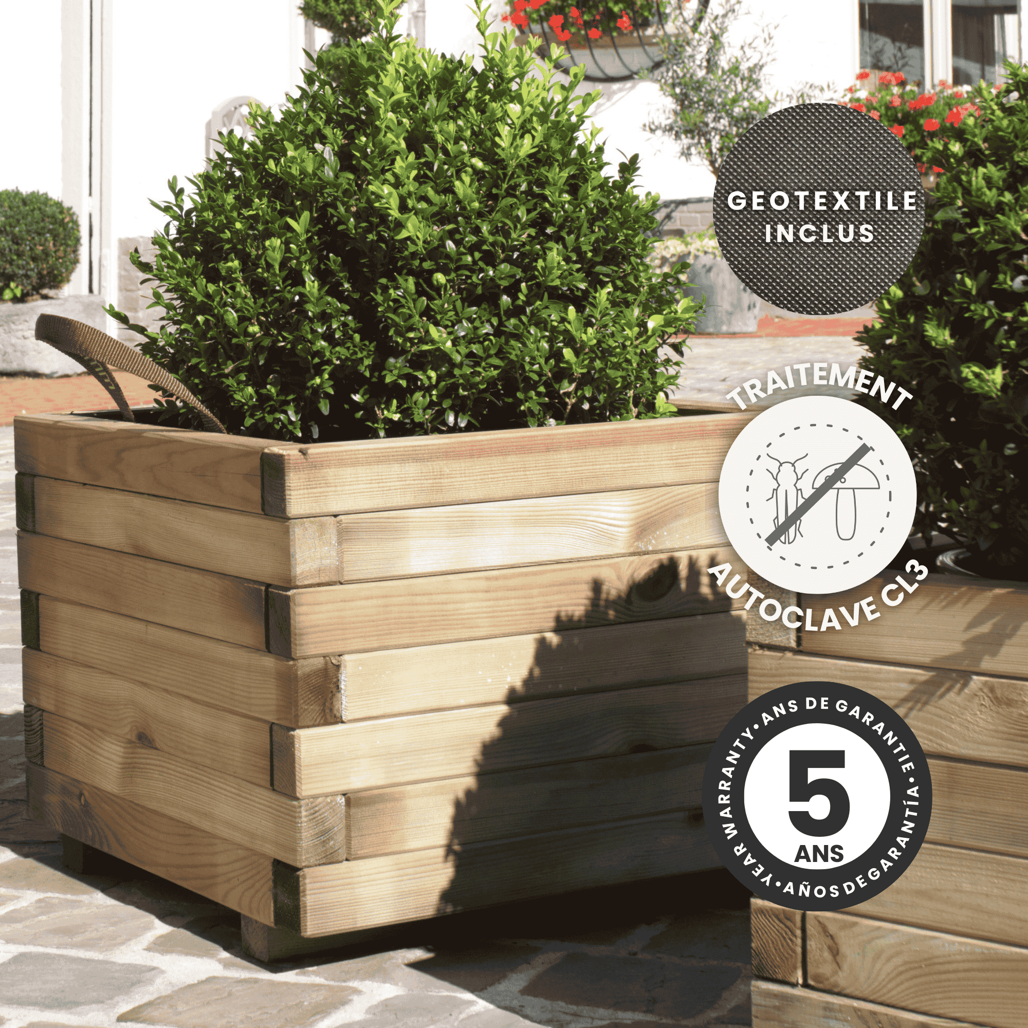 Fabriqué en pin sylvestre traité autoclave 3 vert, ce bac est pensé pour résister aux intempéries et garantir une longévité exceptionnelle. Son design intemporel s’accompagne d’une démarche responsable : le bois est certifié PEFC, provenant de forêts gérées durablement.