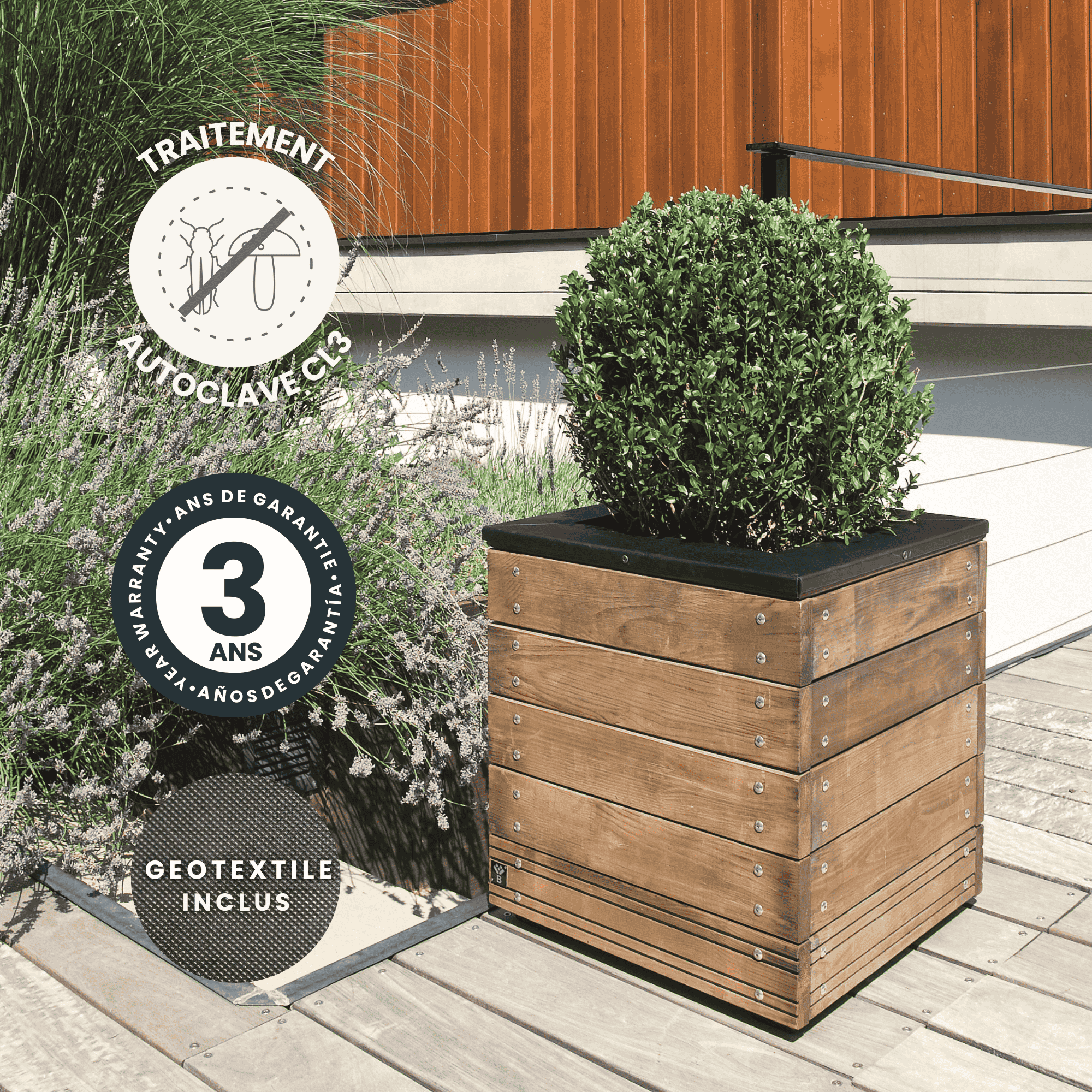 Le bac est livré avec un géotextile intégré, permettant de protéger le terreau tout en assurant un bon drainage. Les pieds en matériaux composites offrent une stabilité parfaite et facilitent l’installation sur toutes les surfaces.