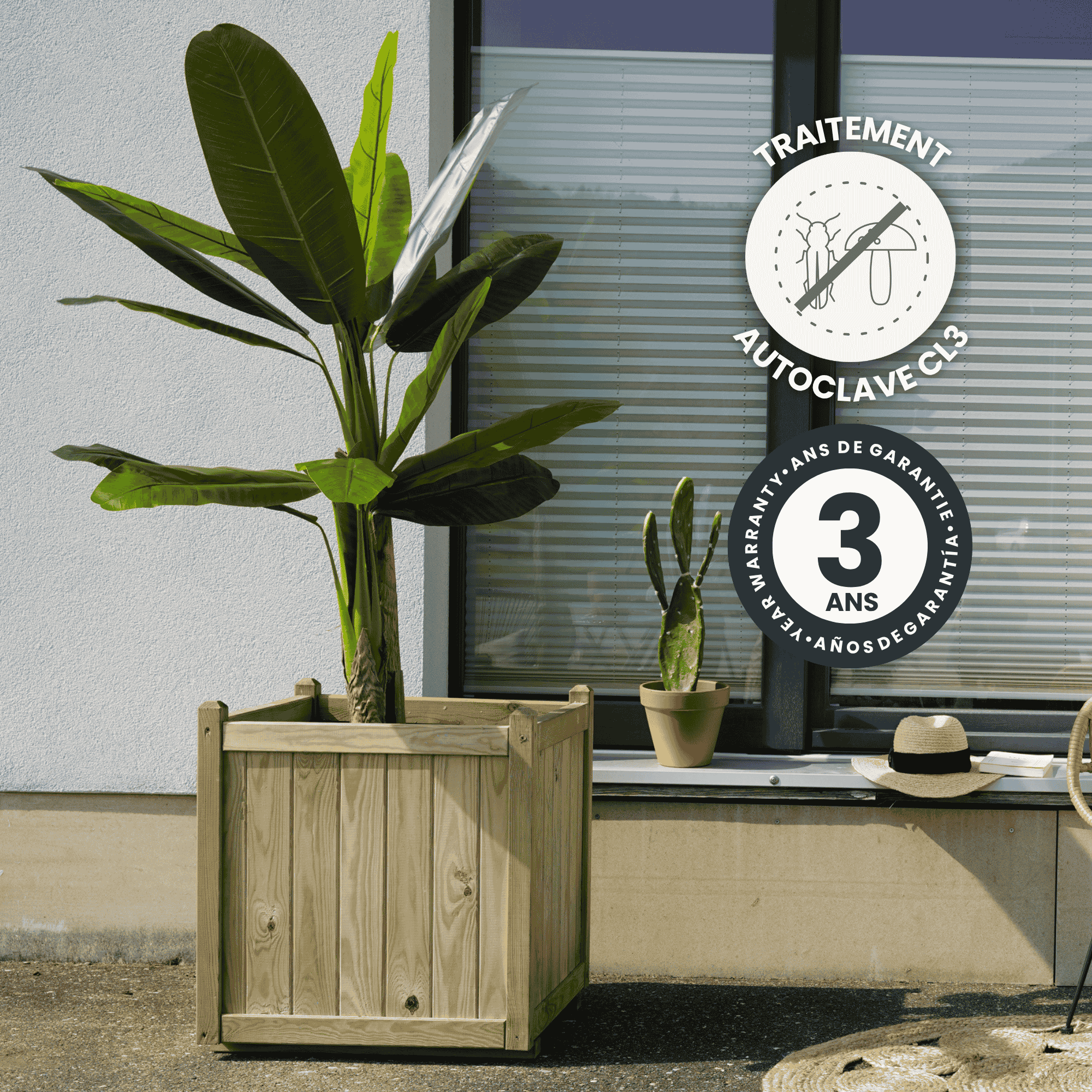 Ses dimensions généreuses de 60 x 60 x 65 cm permettent d'accueillir des fleurs, arbustes ou petits arbres jusqu'à 165 cm de hauteur, comme un mandarinier, citronnier ou même un palmier Phoenix. Ce grand bac en bois est parfait pour structurer vos espaces et mettre en valeur vos plantes préférées.
