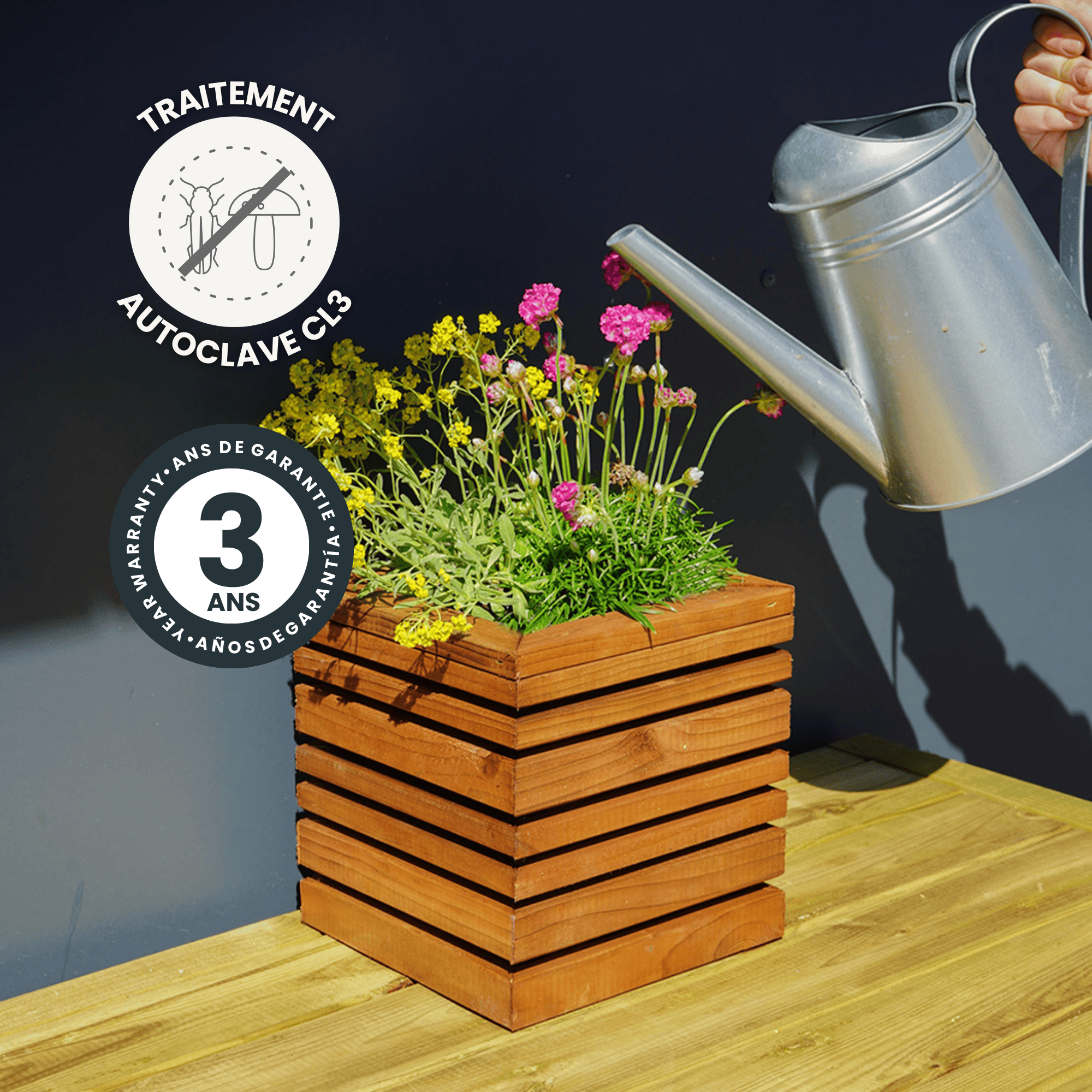 Le bac à fleurs carré LIGN Z allie design moderne et praticité, idéal pour jardin, terrasse ou balcon. Son bois européen teinté brun associé à un intérieur en acier galvanisé crée un effet bi-matière esthétique et protège le bois du contact direct avec l’eau. L’ensemble est certifié FSC®, garantissant une gestion responsable des forêts.