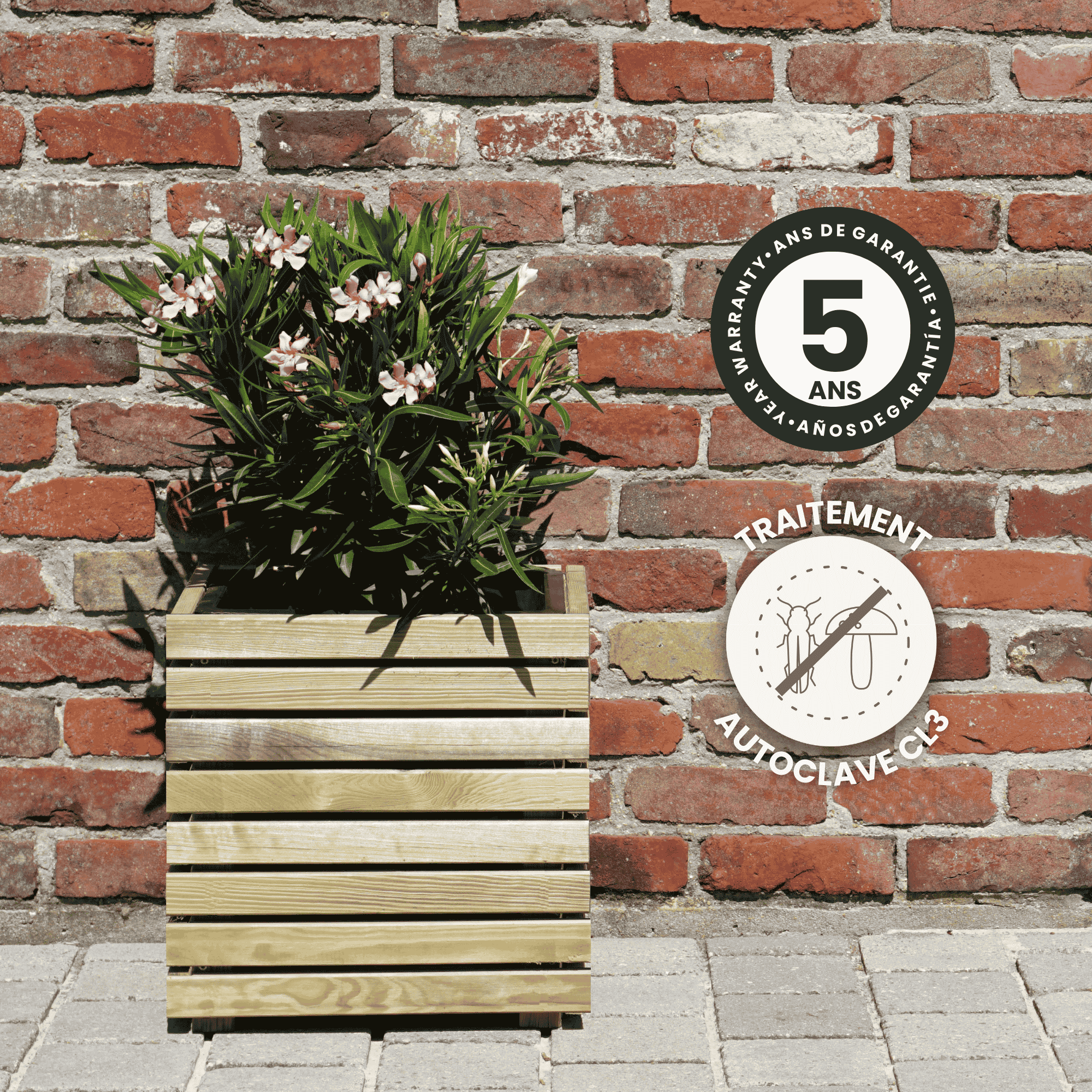 Conçu en pin sylvestre traité en autoclave classe 3, il bénéficie d’une excellente résistance aux intempéries et d’une durabilité accrue, le protégeant contre l’humidité, les insectes xylophages et les champignons. De plus, il est certifié FSC®, garantissant un bois issu de forêts gérées durablement.