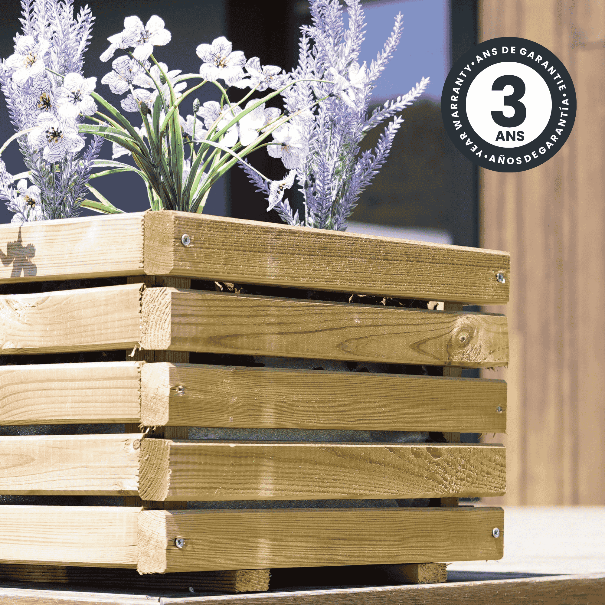 Conçu pour durer, ce bac associe lames en bois fixées par clous et vis pour une robustesse exceptionnelle. Ses pieds de 4 cm garantissent une stabilité optimale, même sur sols irréguliers. Livré prêt à l’emploi avec film de protection, il facilite la retenue de la terre et l’entretien de vos plantes.