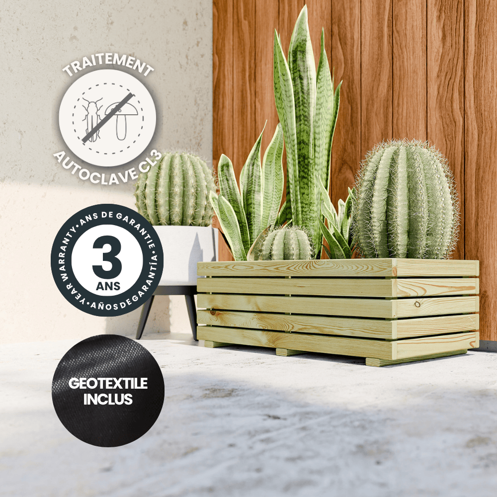Fabriqué avec un assemblage solide de lames en bois fixées par clous et vis, ce bac garantit une robustesse exceptionnelle. Ses pieds de 4 cm assurent une stabilité parfaite, même sur des surfaces inégales. Livré prêt à l’emploi avec un film de protection, il facilite la retenue du terreau et l’entretien de vos plantes.
