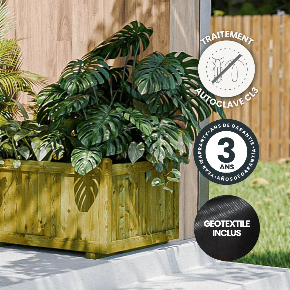 La structure en bois est pensée pour durer : clouage invisible des lames verticales, montants vissés, et deux pieds robustes pour une stabilité optimale. Le résultat ? Un bac à fleurs à la finition soignée qui résiste aux aléas du temps tout en mettant vos plantes en valeur.