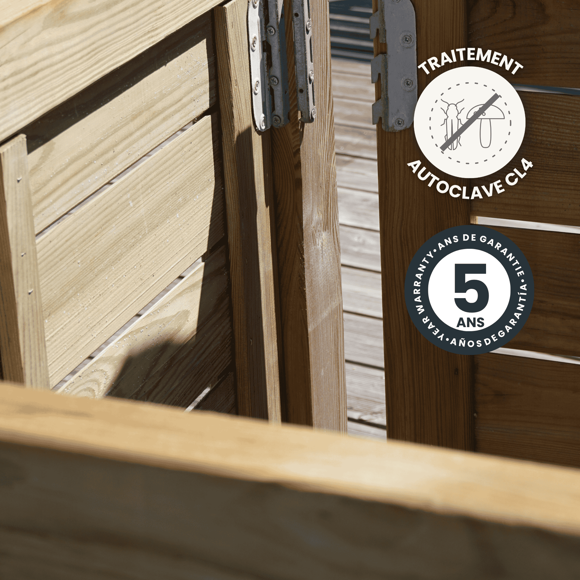 Fabriqué en pin sylvestre, le bac bénéficie d’un traitement autoclave classe 4, assurant une résistance maximale aux intempéries, insectes et champignons. Son aspect naturel et sa teinte harmonieuse en font un élément élégant et intemporel, idéal pour tous types d’environnements, qu’il s’agisse d’un jardin privé, d’un espace commercial ou d’un lieu public.