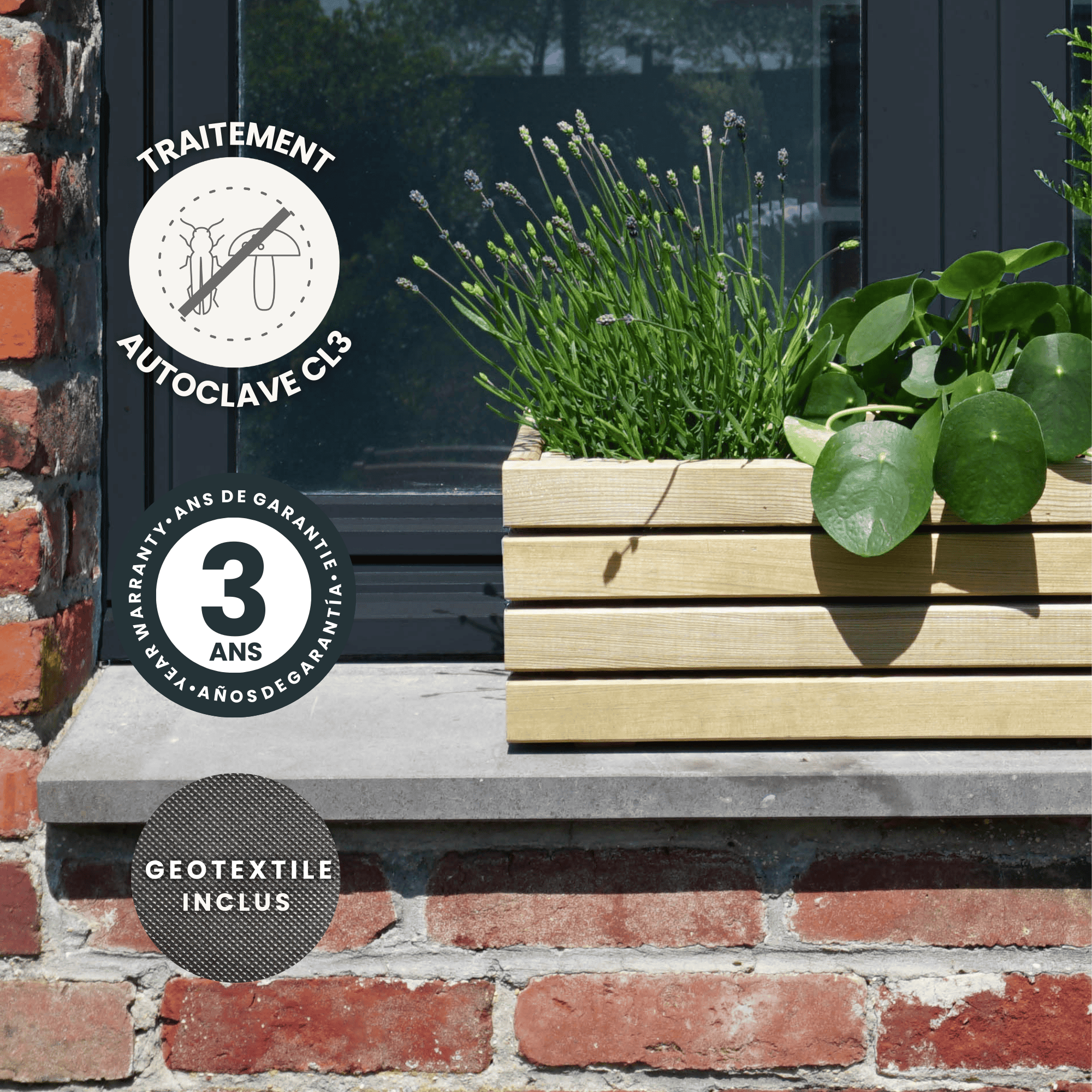 Fabriquée en pin sylvestre traité autoclave classe 3, la jardinière HORIZON bénéficie d’une résistance exceptionnelle aux intempéries ainsi qu’aux champignons et insectes. Durable et robuste, elle peut être utilisée plusieurs années sans altération. Pour encore plus de sérénité, elle est certifiée PEFC, gage de gestion responsable des forêts.