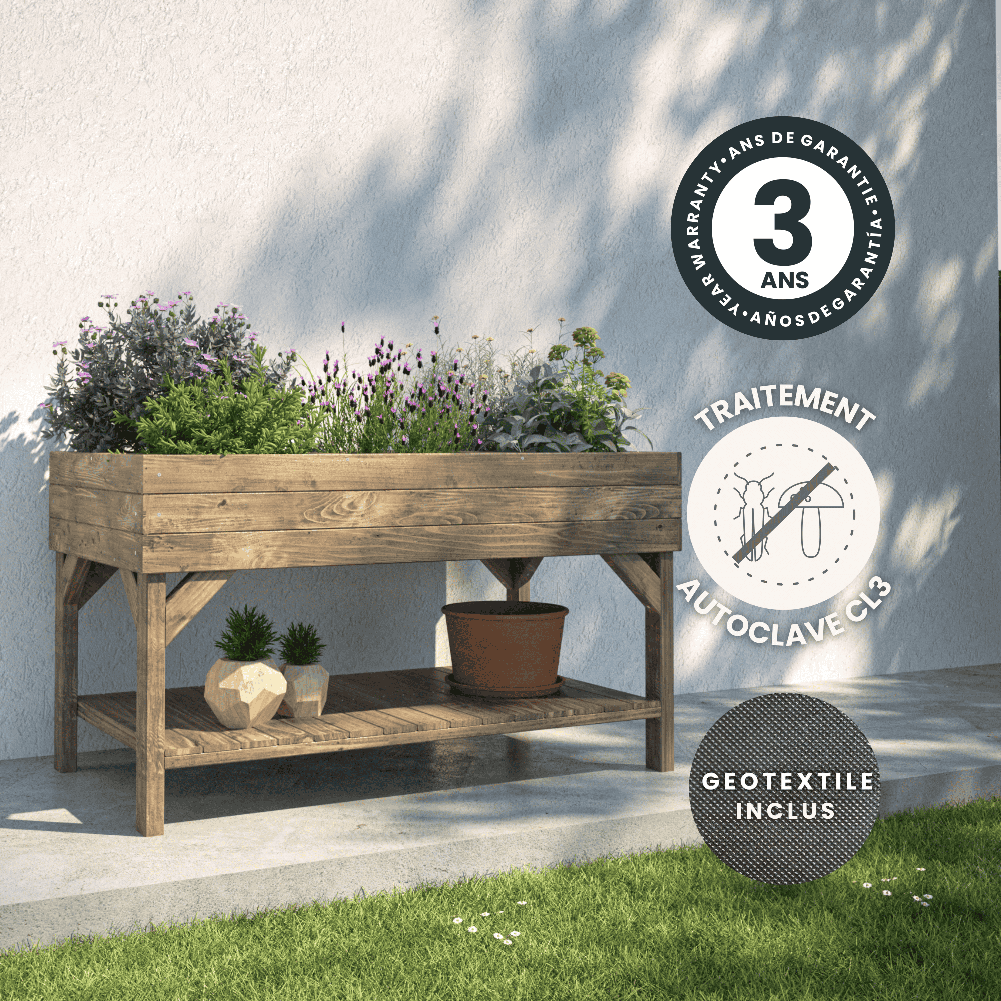 - Feutre géotextile inclus pour limiter les mauvaises herbes