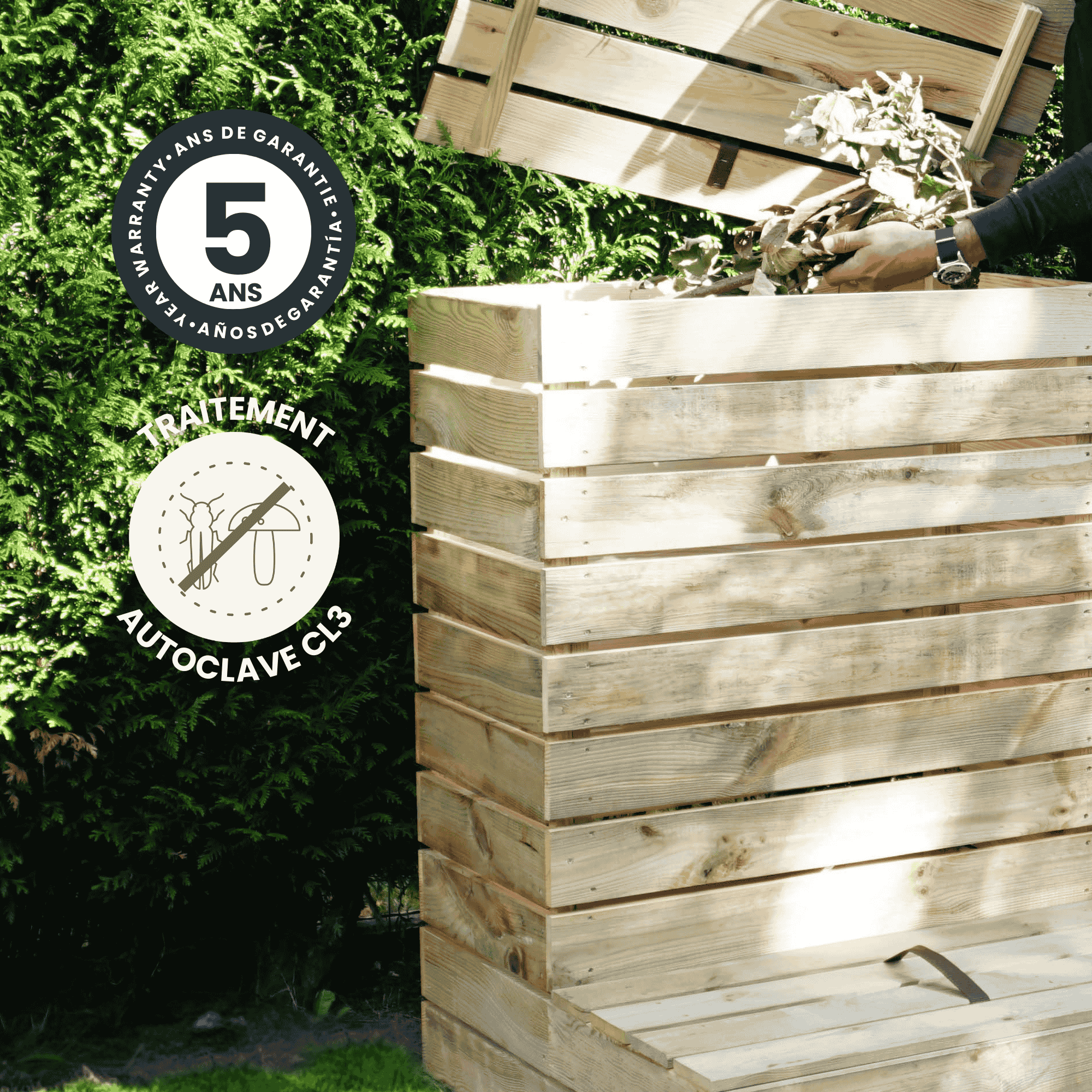 Fabriqué en Pin Sylvestre traité autoclave classe 3 vert, ce composteur est conçu pour résister aux insectes, champignons et à la pourriture, garantissant ainsi une durabilité maximale. La certification PEFC atteste que le bois utilisé provient de forêts gérées durablement, renforçant l’aspect écoresponsable du produit. Le montage est simple et rapide, permettant une mise en service immédiate.