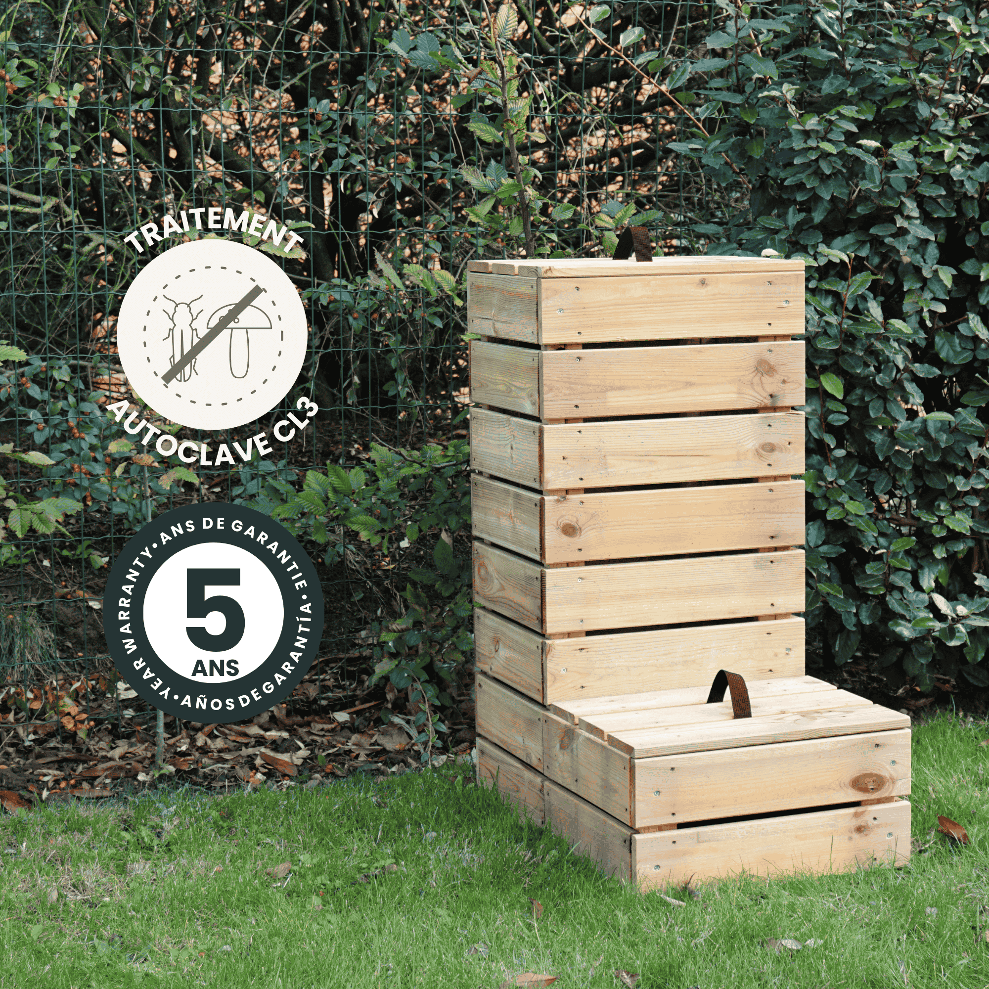 Fabriqué en Pin Sylvestre et traité avec autoclave 3 vert, le composteur ALTO est durable et résistant aux intempéries, aux champignons et aux insectes. Sa certification PEFC garantit que le bois provient de forêts gérées de manière responsable, alliant performance et respect de l’environnement.