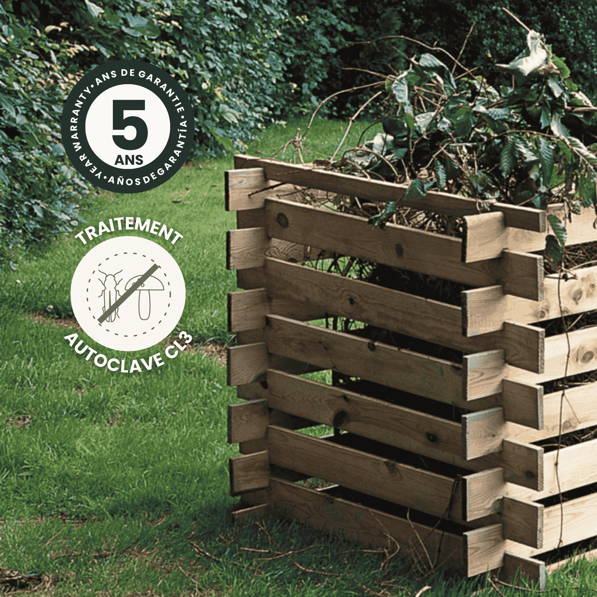 Fabriqué en Pin Sylvestre traité autoclave 3 vert, ce composteur est conçu pour résister aux intempéries et garantir une durabilité maximale. Il est également certifié PEFC, garantissant que le bois provient de forêts gérées durablement, respectant ainsi l’environnement. Le montage est simple et rapide, avec des tutoriels détaillés disponibles pour faciliter l’assemblage et assurer une expérience utilisateur agréable.