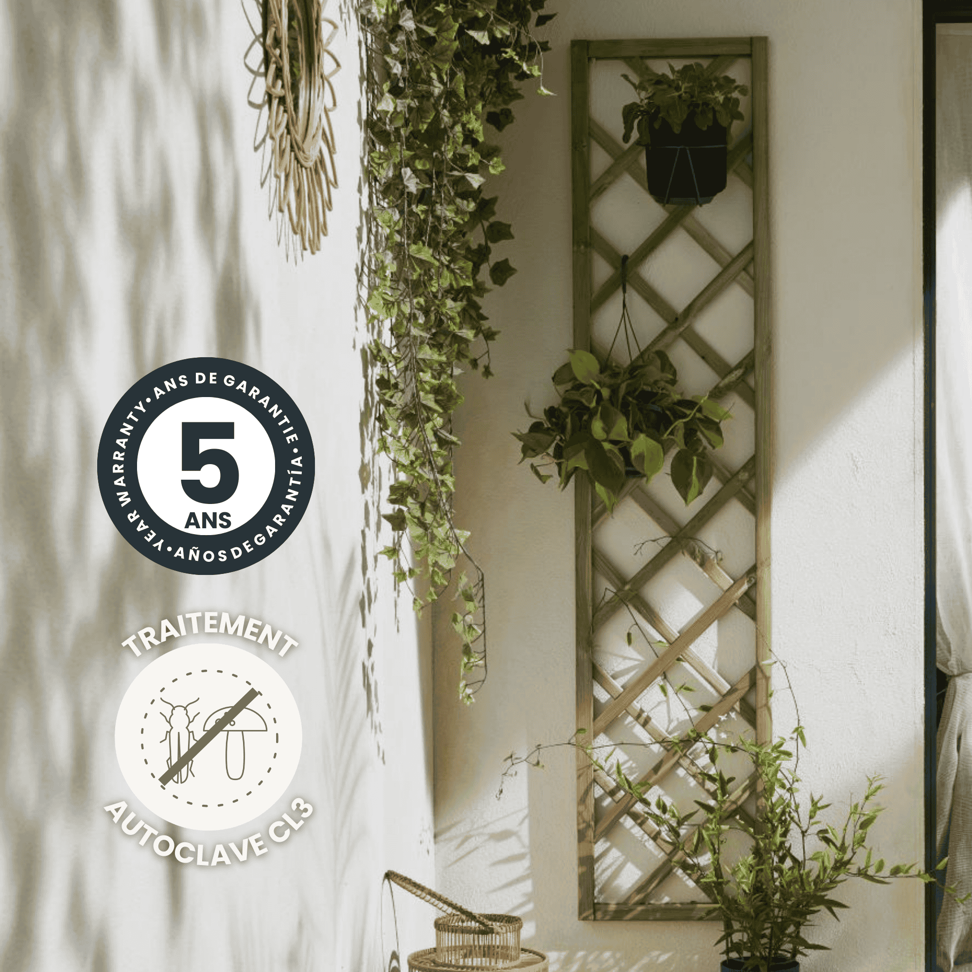 Fabriqué en pin sylvestre certifié PEFC, ce treillis est issu de forêts européennes gérées durablement. Son traitement autoclave vert lui assure une protection efficace contre les champignons et insectes xylophages, garantissant ainsi sa longévité en extérieur.