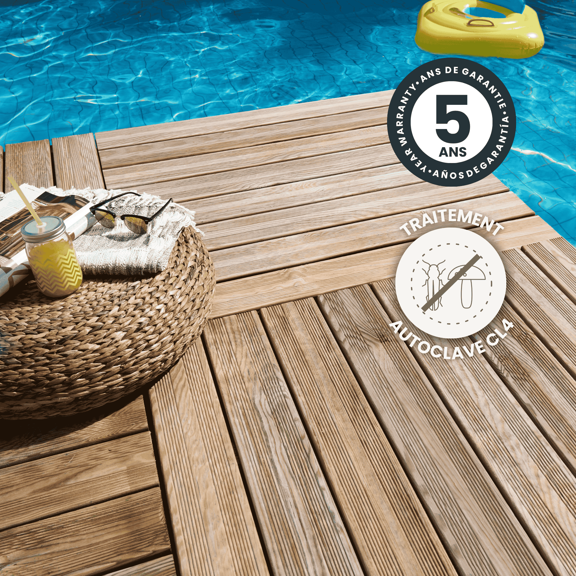 Fabriquées en pin sylvestre certifié PEFC, ces dalles sont traitées autoclave classe 4, assurant leur résistance aux champignons, à l’humidité, et aux insectes. Avec une épaisseur de 3,5 cm, elles sont conçues pour durer, même face aux conditions extérieures les plus exigeantes.