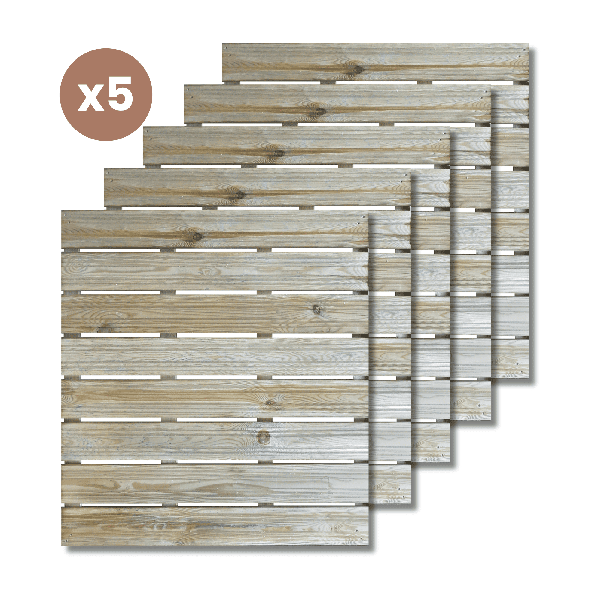 Ce lot de 5 dalles JULIA au format 1x1 m est parfait pour couvrir rapidement une grande terrasse ou créer un espace uniforme autour d'une piscine, d’un spa ou d’une entrée. Le design rainuré double bande et la teinte bois naturelle confèrent un rendu soigné et chaleureux à l’ensemble de votre extérieur.