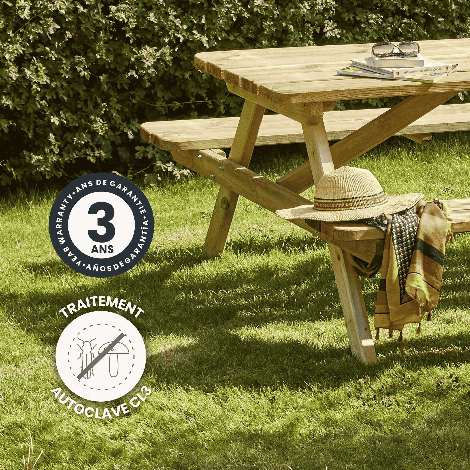 Avec ses dimensions généreuses (180 cm de largeur, 166,4 cm de longueur et 75,9 cm de hauteur), elle offre un espace confortable pour partager des repas ou des moments de détente. Le pin sylvestre traité autoclave classe 3 vert garantit une résistance optimale aux intempéries, assurant une longévité accrue du produit.